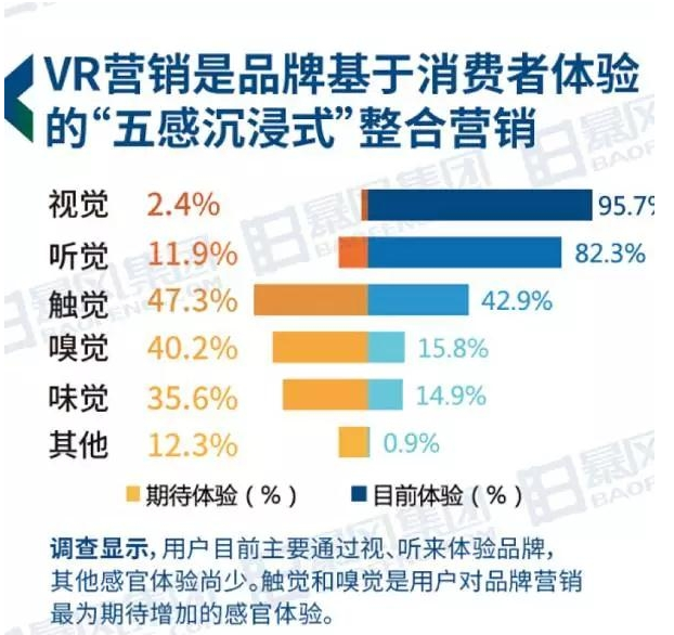 在《中国VR营销白皮书》中指出,VR营销是品牌基于消费者体验的“五感沉浸式”整合营销,调查显示,用户目前主要通过视、听来体验品牌,其他感官体验尚少。触觉和嗅觉是用户对品牌营销最为期待增加的感官体验。知萌咨询机构CEO肖明超对此表示,如果在消费者购物的过程中加上幻想成分,一半真实搭配一半虚拟,让消费者沉浸到商家设定的环境中,则能用最简的成本来帮助消费者去真实触碰广告场景,最大程度地展现出产品的魅力,调动消费者的情绪,实现品牌市场的塑造。