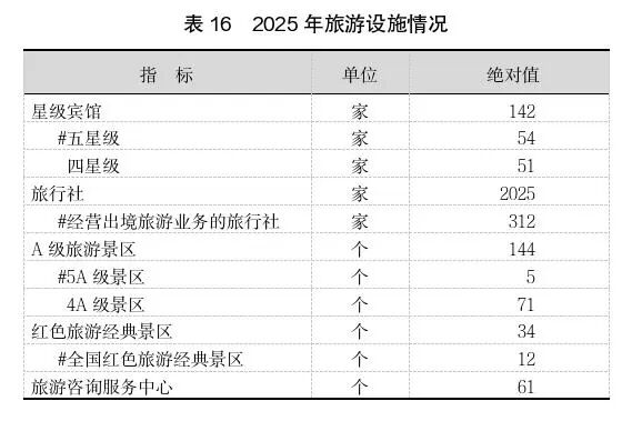 至年末,全市共有市、区公共图书馆20个,总流通人次3366.98万人次;市、区文化馆19个;备案博物馆174个。至年末,全市共有星级宾馆142家,旅行社2025家,A级旅游景区144个,红色旅游经典景区34个(见表16)。