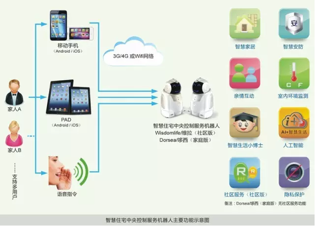 主要做法:整合端口,机器人成为全新智能硬件。智慧家居--通过互联网,远程遥控家中的各种电器设备。智慧安防--与各种安防类传感器连接,感知传感器的相关信息,在发生紧急请款时进行电话报警及信息推送报警,从而避免事故的发生和扩大。亲情互动--通过互联网,利用机器人自带的摄像头与麦克风,远程与家人进行视频及语音沟通。环境监测--实时监测机器人所处环境的温湿度、危险气体、PM2.5、甲醛等空气各项指标,并通过语音等方式及时向用户报警。智慧生活--为用户提供各种信息类智慧查询服务,如家人地址位置查询、包括天气突变和节日提醒在内的多种生活事项提醒、音乐的语音点播、生活百科的智能问答等等。人工智能--自动检测电量,并在电量过低时进行自主回充;学习记忆路径,并在特定条件下调用特定路径进行自动巡防取证;障碍避让,智能识别环境中的障碍物,进行障碍规避,防碰撞,防跌落;情感表达,具备丰富的感情表达能力,能根据自己的喜怒哀乐显示各种表情。社区服务--在提供包括社区品牌、商圈信息在内的各种信息展示的同时,集成物业安保服务,同时打造机器人社区群,提供机器人好友之间的即时通讯功能。隐私保护--为保护用户隐私,提供必要的激活绑定、密码加密、登录加密等功能,在此基础上,为兼顾使用便利性,还提供一键撤布防、监控服务一键开启/关闭等功能。